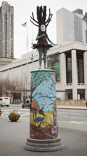 All The World's a Stage Cast silicon bronze, polychrome patina, cast polyurethane resin, glass mosaic, mast concrete, LED lighting, 189.5 inches high, 52 inches in diameter
