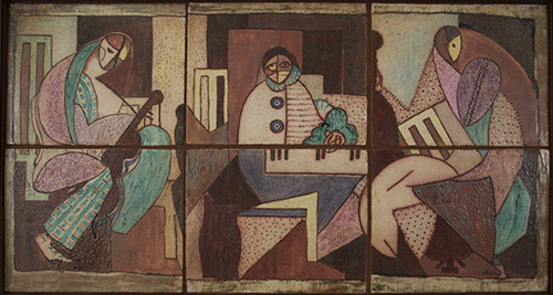 6 tile panel, glazed earthenware with wood frame, 30 x 52 x 2 inches